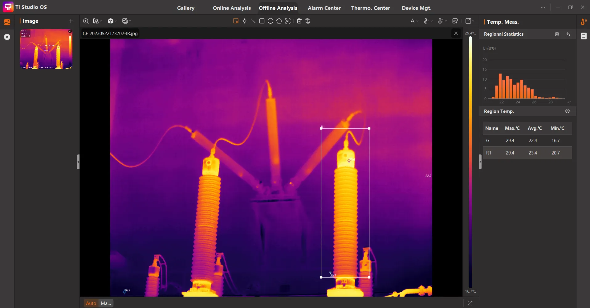 TI Studio 는 PC 윈도우 기반의 강력한 온도 분석프로그램입니다. 정확한 온도 분석을 위한 다양한 온도 측정 분석툴과 명확하고 디테일하게 열화상 이미지를 튜닝 할 수 있는 종합적인 분석 기능을 제공합니다. 또한 열화상카메라 스트리밍과 제어 그리고 다양한 알람 메커니즘 기능이 제공되며, 직관적인 인터페이스로 조작이 쉽고, 자동 보고서 레포팅 기능 제공되어 산업 시설 점검, 연구 및 실험 분석 등 다양한 용도에서 활용이 가능한 강력한 소프트웨어 입니다