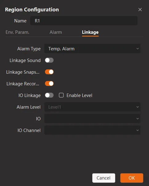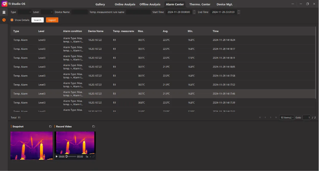 • 온도 알람, 온도 상승 알람 등 온도 데이터를 기반으로 한 다양한 알람 메커니즘을 지원하여 전체 영상 프레임 또는 사용자 온도 측정 규칙 및 구역에 대해 별도의 설정이 가능합니다. 또한 이 소프트웨어는 계층적 알람을 달성하기 위해 여러 알람 임계값 설정도 지원합니다.