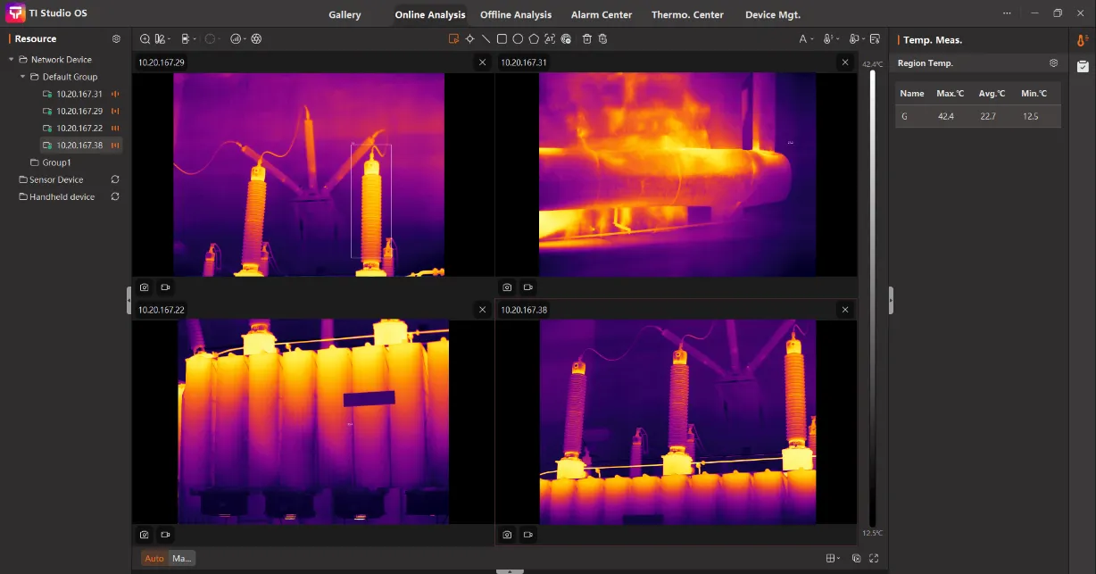 • 이 소프트웨어는 산업용 온라인, 휴대용, 열화상 모듈 및 기타 온도 측정 하드웨어 제품에 여러대 동시에 액세스할 수 있도록 지원합니다, 또한 카메라 장치 자동 검색 및 인식, 실시간 화면 보기 및 기타 온도 측정 기능을 제공합니다.