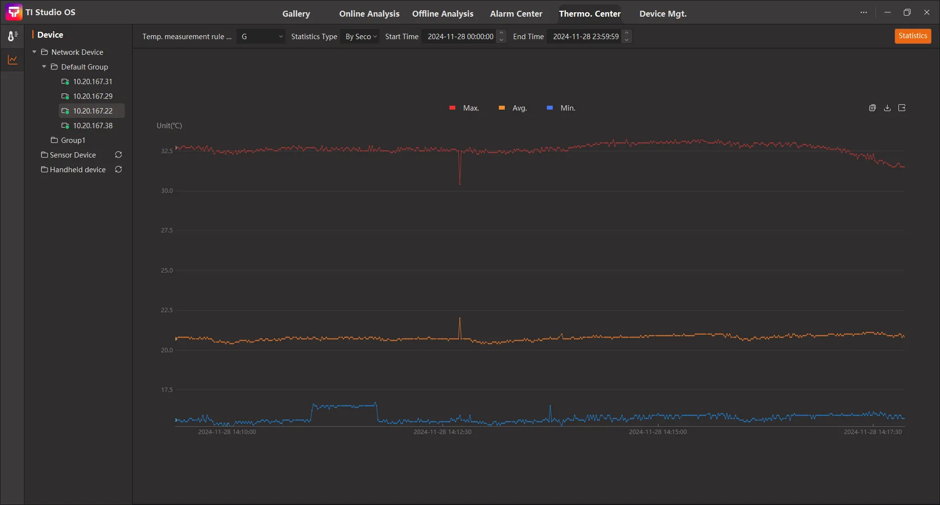 • 프레임, 초, 분, 시간의 네 가지 시간 세분화 분석을 선택하여 온도 데이터 수집을 지원할 수 있으며, 수집된 데이터에 대한 시간별 온도 변화값 추세 곡선 그래프 및 및 수치화 통계 분석을 할 수 있습니다. 또한 수집된 원본 온도 데이터를 이미지나, CSV 수치 데이터로 변환하여 내보낼 수도 있습니다.